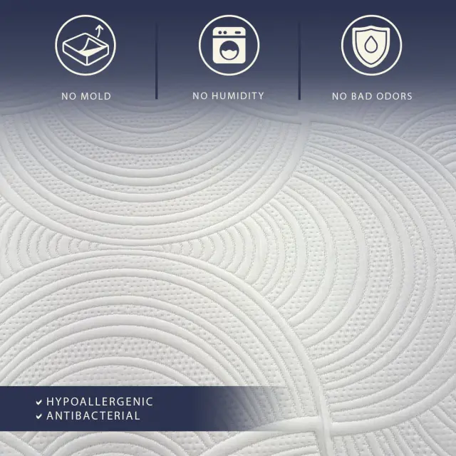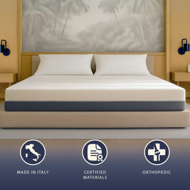 MEMORY FOAM VZMETNICA. Zgornja plast iz počasno vračajoče se spominske pene (Memory Foam) zagotavlja visoko ergonomijo, saj se prilagaja telesni temperaturi in naravnim oblikam telesa. Višina 22 cm in zonska struktura omogočata enakomerno porazdelitev teže, zmanjšujeta točke pritiska in izboljšujeta kakovost spanja. Idealno za osebe z mišičnimi ali ledvenimi bolečinami, pomaga ohranjati pravilno poravnavo hrbtenice čez noč. WATERFOAM VZMETNICA. Notranje jedro je izdelano iz hipoalergene pene Waterfoam najnovejše generacije, visoko elastične, ekološke in brez škodljivih snovi, ki zagotavlja trdno, a udobno oporo. Tehnologija zagotavlja dolgo življenjsko dobo, se prilagaja gibanju telesa in ohranja prvotni obliko. Visoka elastičnost in podpora vsaki coni telesa naredijo to vzmetnico idealno za tiste, ki iščejo ortopedsko udobje brez pretirane trdote, pri tem pa ohranja stabilnost in kompaktnost. PREZRAČLJIVA VZMETNICA. Zračna elastična prevleka in jedro iz odprtih celic zagotavljata optimalno kroženje zraka. To preprečuje nabiranje vlage, plesni in neprijetnih vonjav ter vzdržuje konstantno, suho mikroklimo med spanjem. Konstrukcija vzmetnice zagotavlja svežino in higieno tudi v toplih mesecih, kar omogoča zdravo in udobno okolje za spanje. HIPOALERGENA VZMETNICA. Izdelana iz certificiranih in varnih materialov, vzmetnica je hipoalergena, antibakterijska in odporna proti pršicam. Tehnična tkanina preprečuje širjenje alergenov in je idealna tudi za astmatike ali alergike. Varen in zdrav izbor za maksimalno udobje med spanjem z garancijo Made in Italy. NAMESTITEV IN VZDRŽEVANJE. Naše vzmetnice so dostavljene zvite in vakuumsko pakirane za lažji transport. Po odpiranju naj vzmetnica nekaj ur pridobi prvotno obliko. Dolga življenjska doba je zagotovljena z enostavnim vzdrževanjem: redno obračanje glava-noge in vrtenje zgoraj-dol. Prevleka je snemljiva in pralna v pralnem stroju pri nizki temperaturi brez agresivnih detergentov.