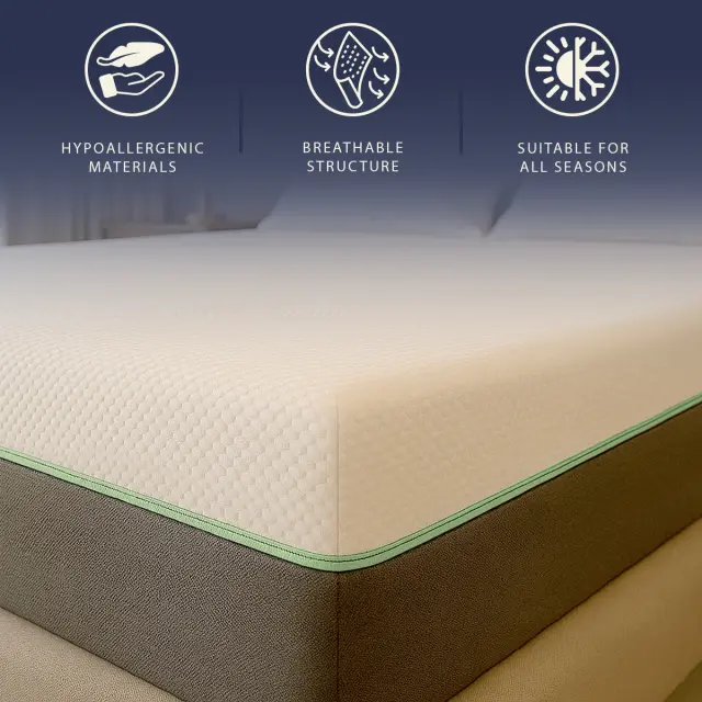 MADRAC Z DVOSTRANSKO PODPORO. Osnova udobja je hibridna tehnologija: posamezne žepkaste vzmeti, zaprte v okvirju iz hipoalergene pene, delujejo v sinergiji s plastjo spominske pene in zagotavljajo natančen odziv na nočne premike. Hibridni madrac nudi pravilno podporo vsaki del telesa, zmanjšuje prenos gibanja in izboljšuje anatomsko prilagajanje. 25 cm visok madrac za globok in neprekinjen spanec.