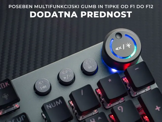 Genesis Thor 400 RGB omogoča intuitiven in enostaven dostop do 12-ih funkcionalnih / multimedijskih tipk (F1-F12), kar bo cenil vsak zahteven uporabnik. V trenutku lahko prilagodite tudi svetlost osvetlitve in glasnost preko posebnega vrtljivega gumba, ki se nahaja v zgornjem desnem kotu tipkovnice.