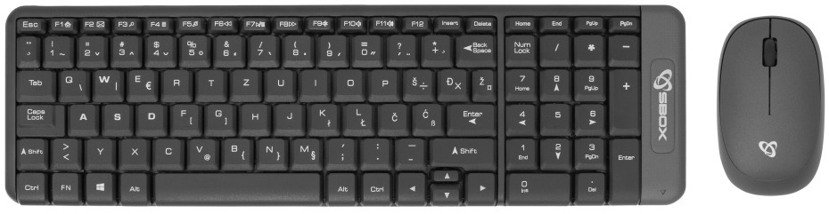 Ločljivost (DPI): 1200 Število tipk: 3D - 3 gumbi (miška) / 100-101 (tipkovnica) Material miške: Plastika Dimenzije miške (mm): 99x59x30 Vrsta stikala: Membranska Življenjska doba: 5 M pritisk Barva: Črna/Siva Material : Plastični Vmesnik: 2,4 GHz (USB sprejemnik) Dodatne dvižne noge: Da Dimenzije (mm): 380x112x19 Teža (g): 305 - tipkovnica / 45 - miška Razpoložljive postavitve: HR, SRB, US Napajanje: 2 x AAA baterija (miška) ) / 2 x AAA baterija (tipkovnica) Združljivost: Windows 7 / 8 / 10 i MAC OS 10.5.1+