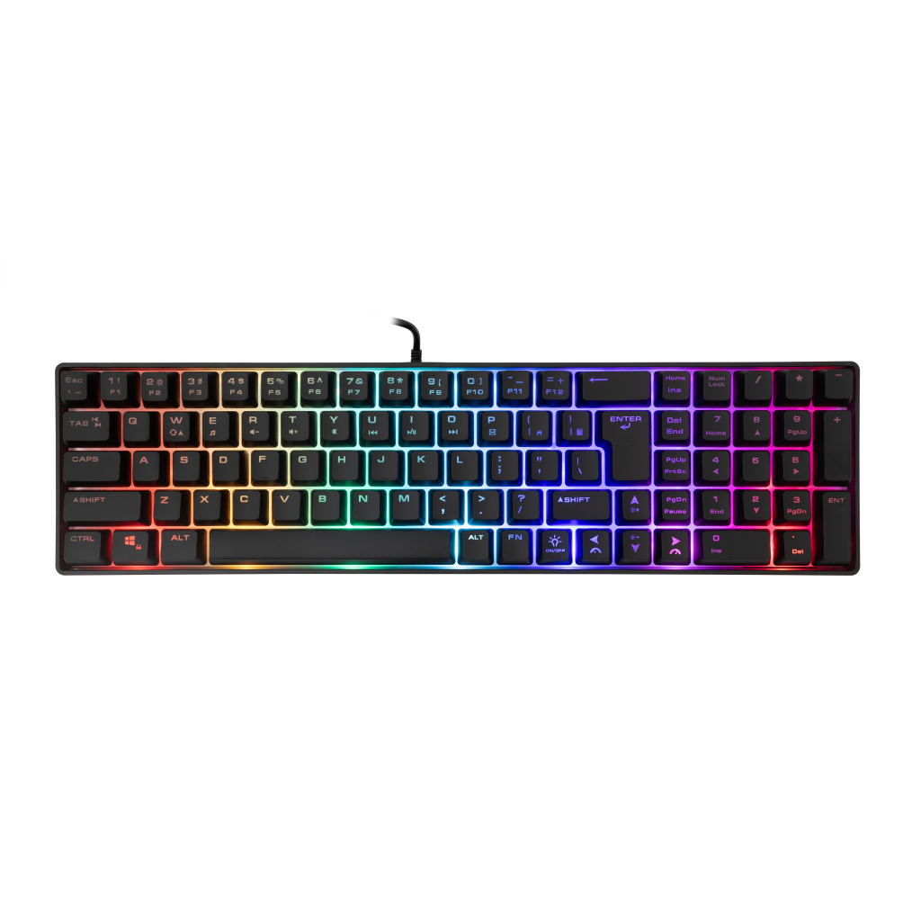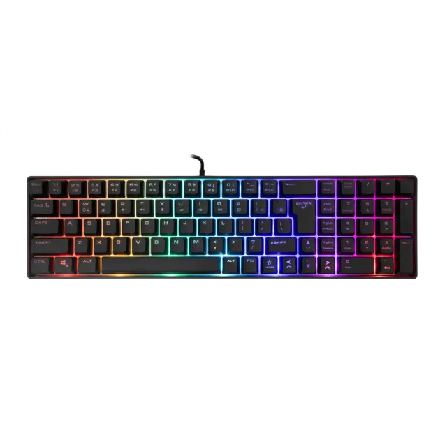 Število tipk: 85/86 Razpored tipk: Polna postavitev Vrsta stikala: Membrana Življenjska doba: Več kot 10 M pritiskov Anti-Ghosting: 19 tipk Osvetlitev: Mavrični učinek / VKLOP/IZKLOP + dihanje Barva: Črna Material: Plastika Vmesnik: USB 2.0 Dodatno dviganje noge: Da Dolžina kabla (m): 1,5 Pleten kabel: Ne Razpoložljive izvedbe: CRO,SRB,US Mere (mm): 368x102x36 Teža (g): 525