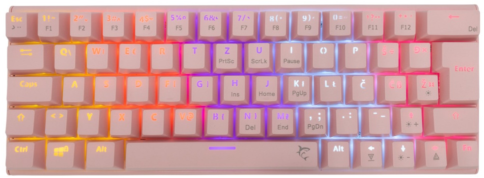 Število tipk: 63/64 Razpored tipk: Kompaktno Tip stikala: Mehansko - modro Življenjska doba: Več kot 50 M pritiskov Anti-Ghosting: Da / 26 tipk Osvetlitev: Mavrični učinek / 17 različnih učinkov Barva: Roza Material: Plastika Vmesnik: Tip C - USB 2.0 (snemljiv) Dodatne dvižne noge: Da Dolžina kabla (m): 1,5 Pleteni kabel: Ne Razpoložljive izvedbe: CRO,SRB,US Mere (mm): 292x105x35 Teža (g): 430