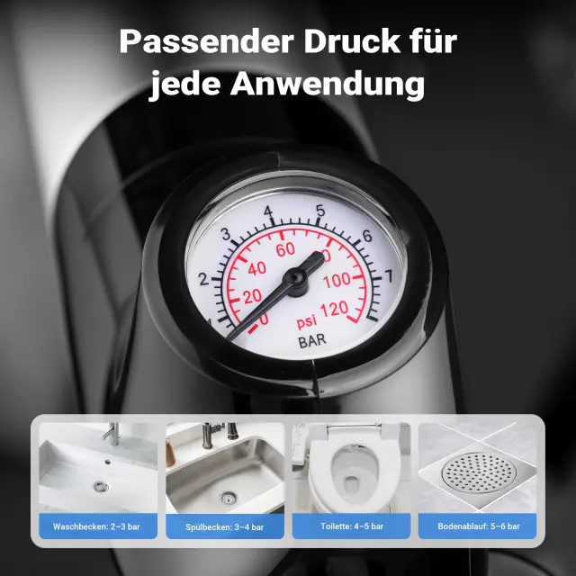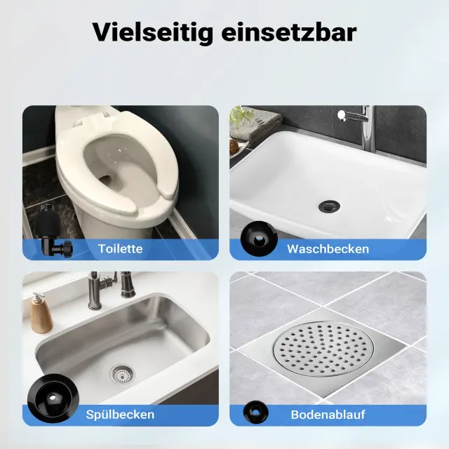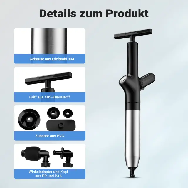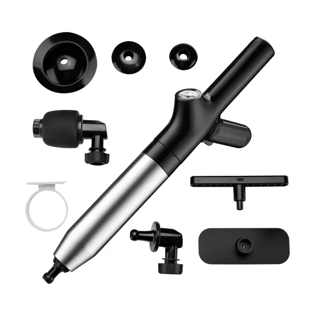 Obseg dobave vključuje različne nastavke, ki omogočajo prilagodljivo prilagoditev različnim vrstam odtokov. Čistilec odtokov na stisnjen zrak se zato lahko uporablja univerzalno – od kuhinjskih pomivalnih korit in talnih odtokov do umivalnikov in stranišč.