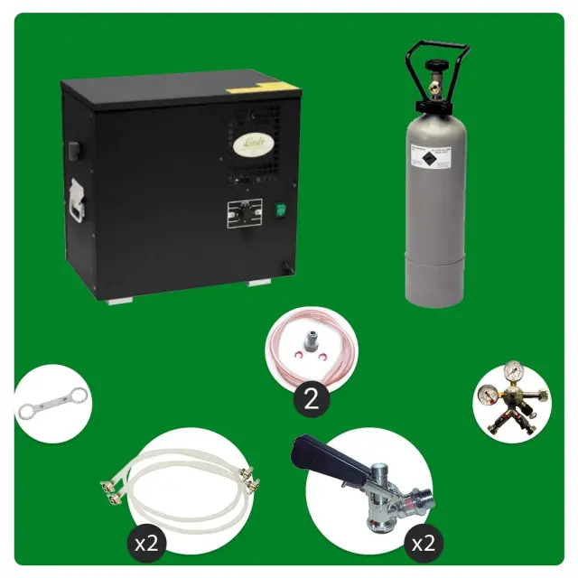 Set je popolnoma opremljen: vključuje regulator tlaka za CO2 na 3 bar, 2 kg CO2 jeklenko, 2 CO2 cevi po 1,5 m, 2 pivske cevi John Guest z 2 m dolžino in priključki, nepogrešljiv ključ za CO2 ter adapterje za različne pipe (brez pip, na voljo trikotna pipa).