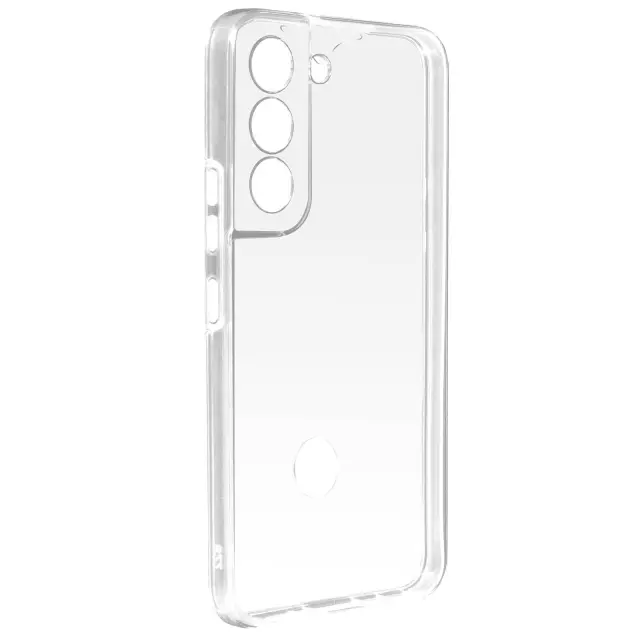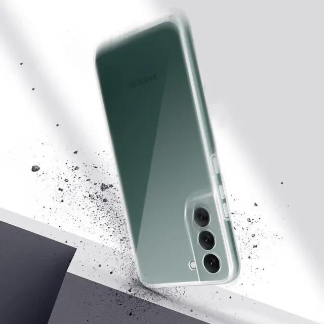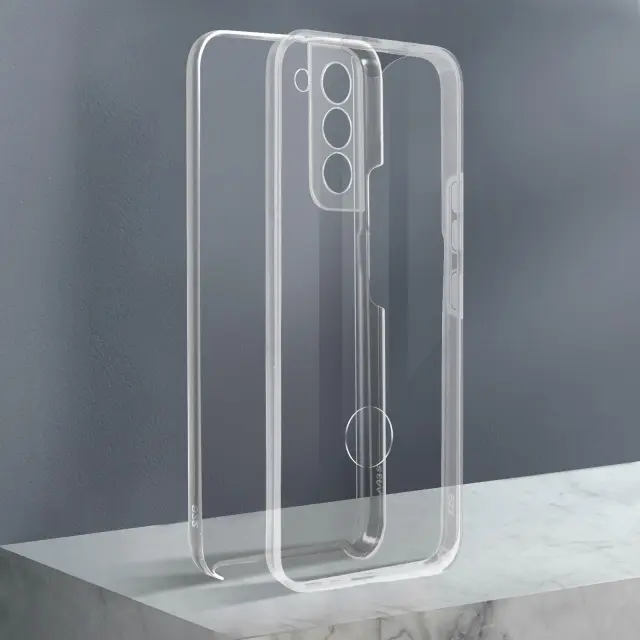 Prozoren ovitek za Samsung Galaxy S22. Ta vsestranska 360-stopinjska zašcita ima trdo zadnjo stran iz polikarbonata, odporno na udarce, in nezlomljivo sprednjo stran iz polimera, ki pokriva zaslon in stran telefona.