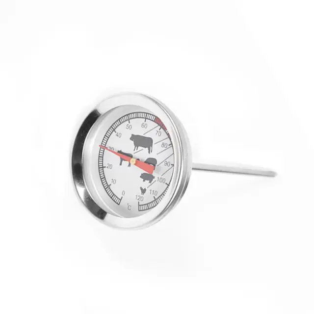 Termometer za pečenje. Nepogrešljiv pri peki večjih kosov mesa. Z lahko berljivim indikatorjem in kazalcem. S prikazom za različne vrste mesa.