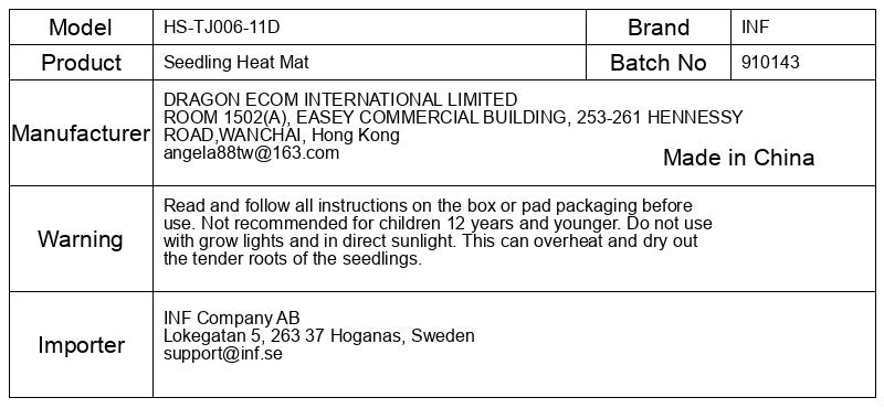 Pred uporabo preberite in upoštevajte vsa navodila na embalaži škatle ali blazinice. Ni priporočljivo za otroke, stare 12 let in manj. Ne uporabljajte z rastnimi lučmi in na neposredni sončni svetlobi. To lahko pregreje in izsuši nežne korenine sadik.