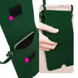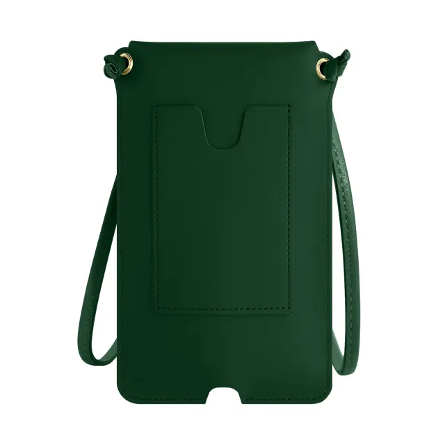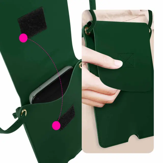 Naramna torba iz temno zelenega umetnega usnja za enostavno prenašanje pametnega telefona. Ima predal za shranjevanje na zadnji strani, ki vam omogoca, da imate svojo kartico blizu. Njegov 120 cm dolg trak omogoca nošenje kot naramnico ali okoli vratu.