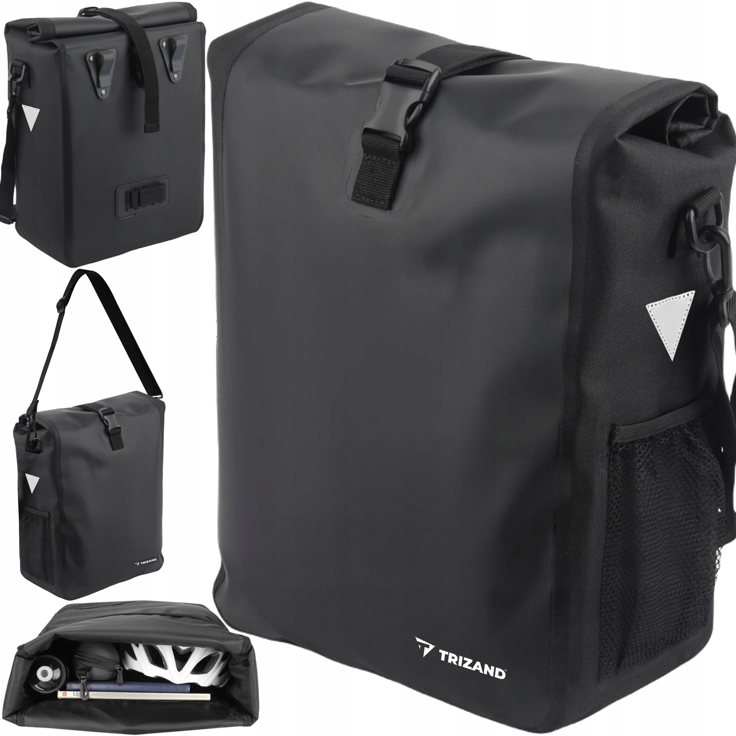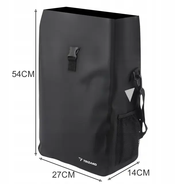 VODOODPORNA + VARNOST – torba je izdelana iz nepremočljivega in zelo močnega materiala PVC + oxford 500D, zato bo odlično zaščitila tudi težke predmete tudi v neugodnih vremenskih razmerah . Na stranskih odsevnikih so dodatne torbice, ki povečajo vidljivost uporabnika po temi .