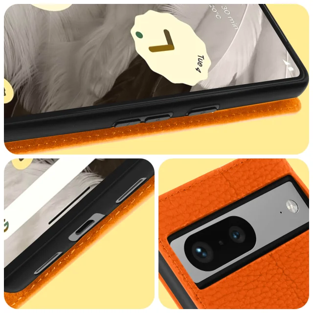 Ovitek za Google Pixel 7 z ucinkom teksturiranega usnja Orange. Ima vec prostorov za shranjevanje in se lahko spremeni v video nosilec. Ima ohišje za zašcito mobilnega telefona pred udarci. Nastavek za trak za integracijo vaše osebne vrvice
