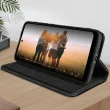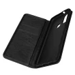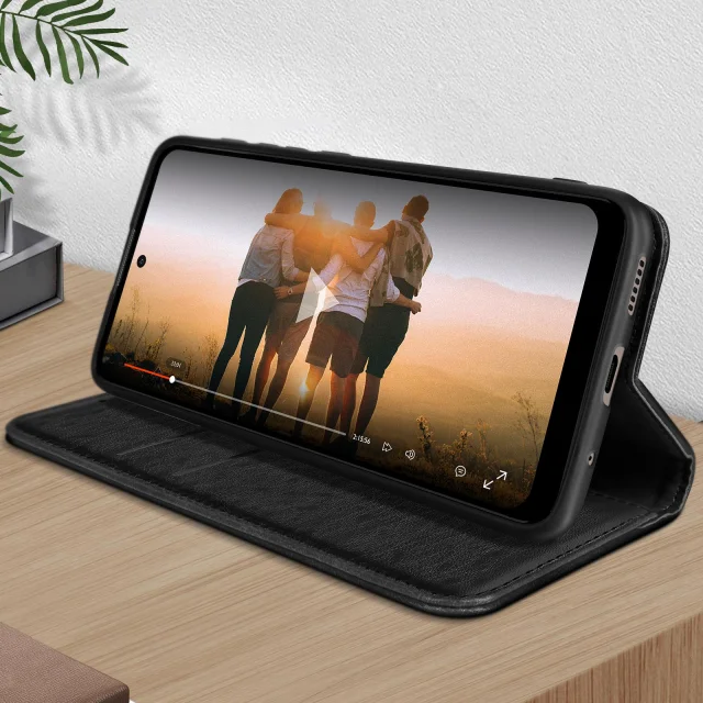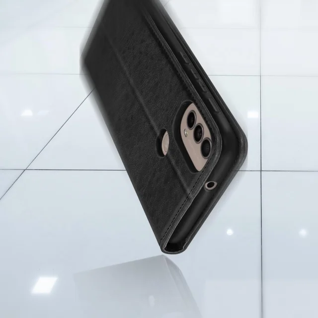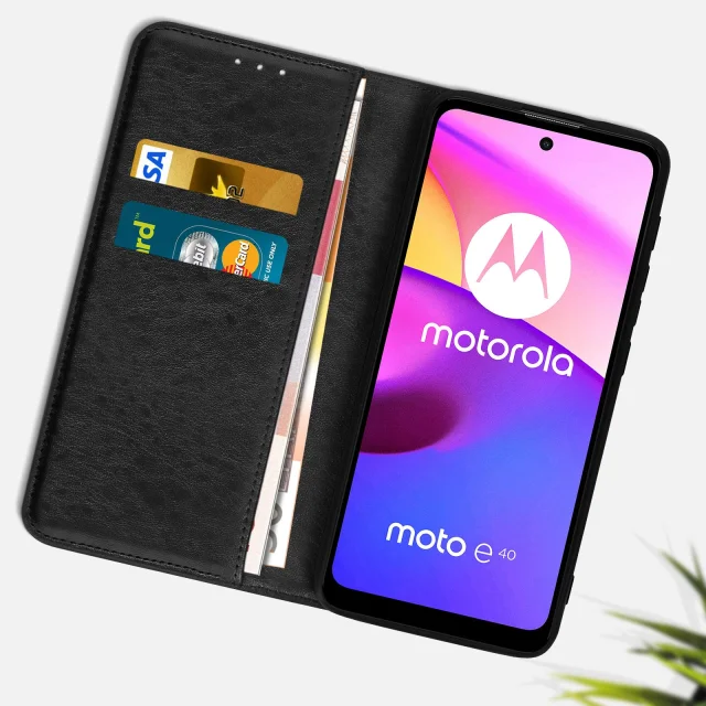 Crna torbica Motorola Moto E40, E20 in E30 nudi popolno zašcito za vaš mobilni telefon. Ta usnjena prevleka ima vec prostorov za shranjevanje in se lahko spremeni v nosilec za video. Ta etui ima diskretno magnetno zapiranje.
