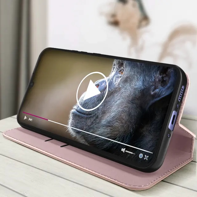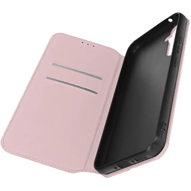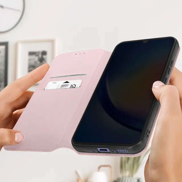 Ovitek za Samsung Galaxy A34 5G. Ta Ovitek ima reže za kartice v magnetni preklopni vložku in trdno, prožno silikonsko ohišje. Deluje tudi kot vodoravna podpora za ogled vaših videoposnetkov.