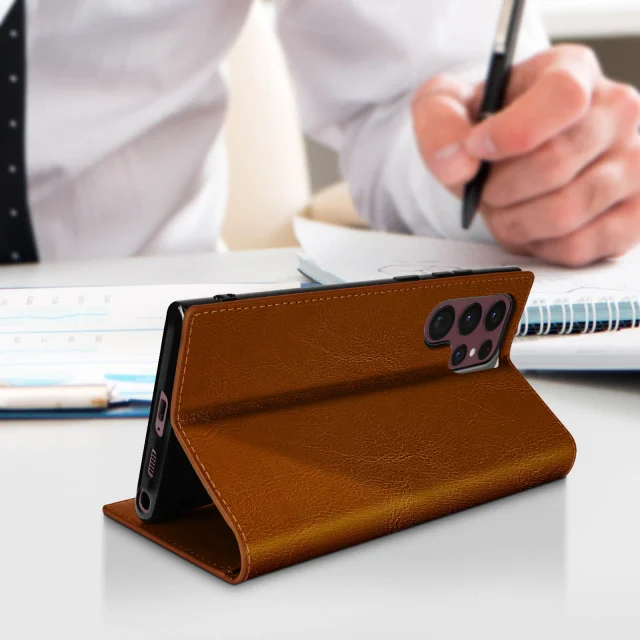 Usnjena torbica za zaščito vašega Galaxy S22 Ultra. Izjemno robusten in dolgotrajen premaz, hkrati pa zelo tanek. Eleganten in prefinjen dizajn, ki vas bo spremljal v vsakdanjem življenju. Zavihek z denarnico in držalom za kartico za lahko potovanje.