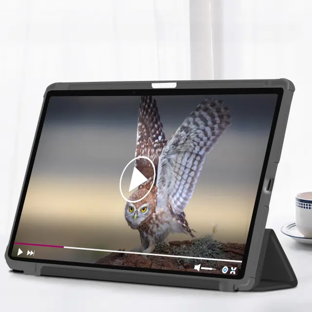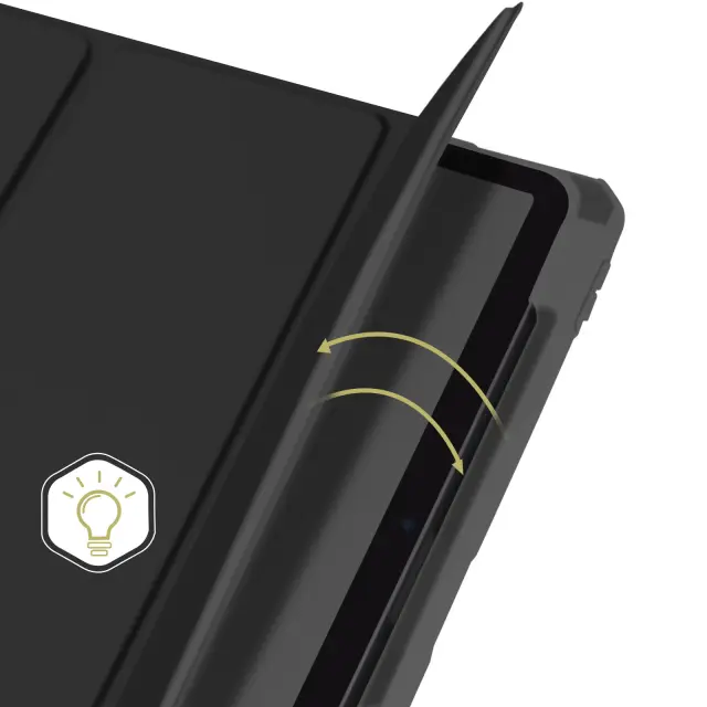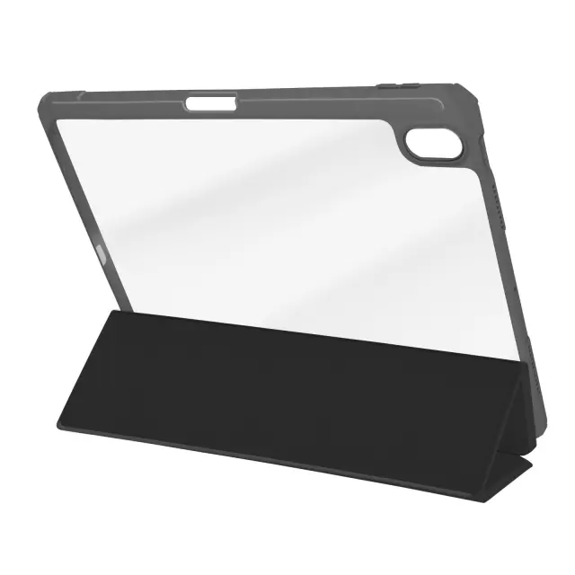Črno ohišje folio združuje elegantno obliko in učinkovito zaščito za vašo [ime naprave].. Prevlečen z usnjenim ohišjem, obrisom iz silikonskega gela in prozorno akrilno hrbtno stranjo.. Funkcija spanja samodejno preklopi iPad v stanje mirovanja, ko zaprete pokrov. Trikratni zavihek lahko spremenite v stojalo za gledanje videoposnetkov ali tipkanje na tipkovnico.