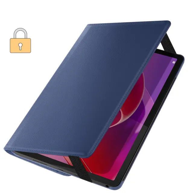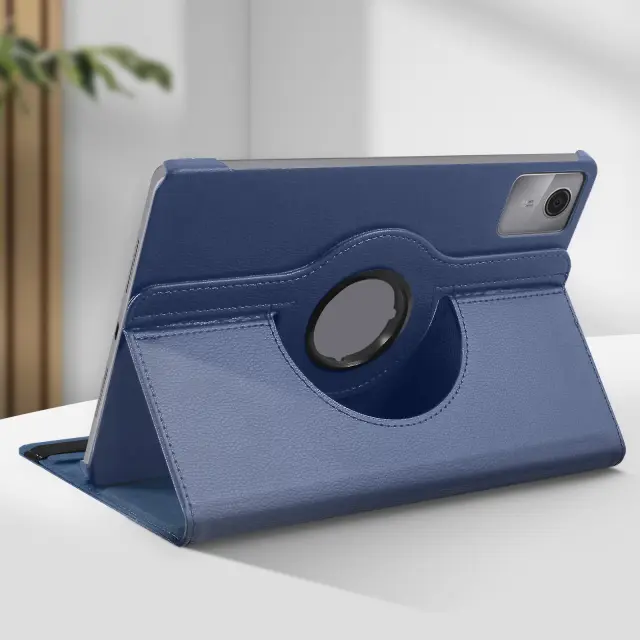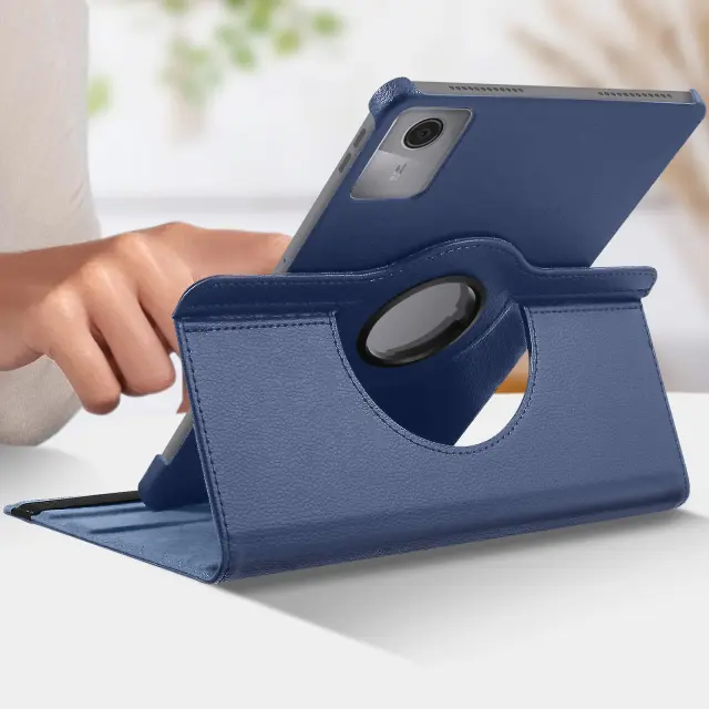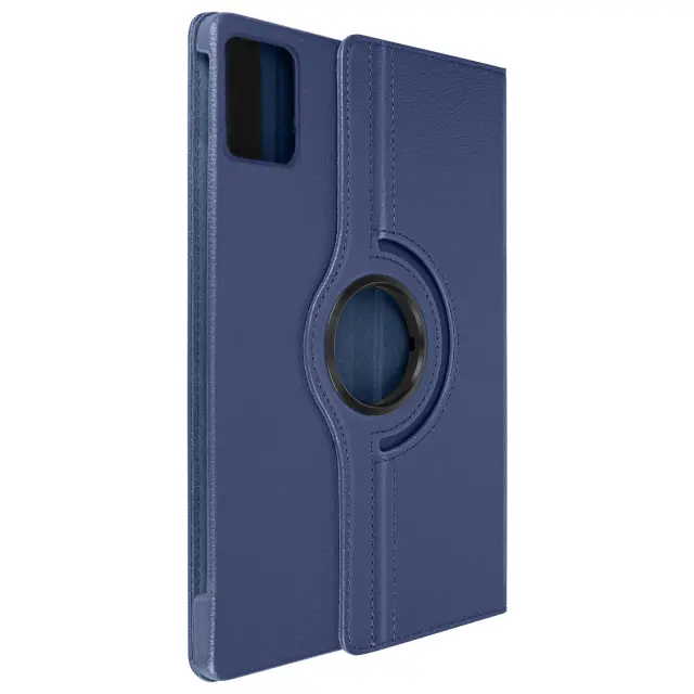Nočno modro usnjeno ohišje, posebej zasnovano za zaščito vaše [ime naprave].. 360° vrtljiv pokrov za prilagodljivo gledanje v ležečem ali pokončnem načinu. Vsestranska zaščita za tablični računalnik s trdo lupino in mehko imitacijo usnja. Varno zapiranje z elastičnim trakom na notranji strani, ki drži zavihek zaprt.