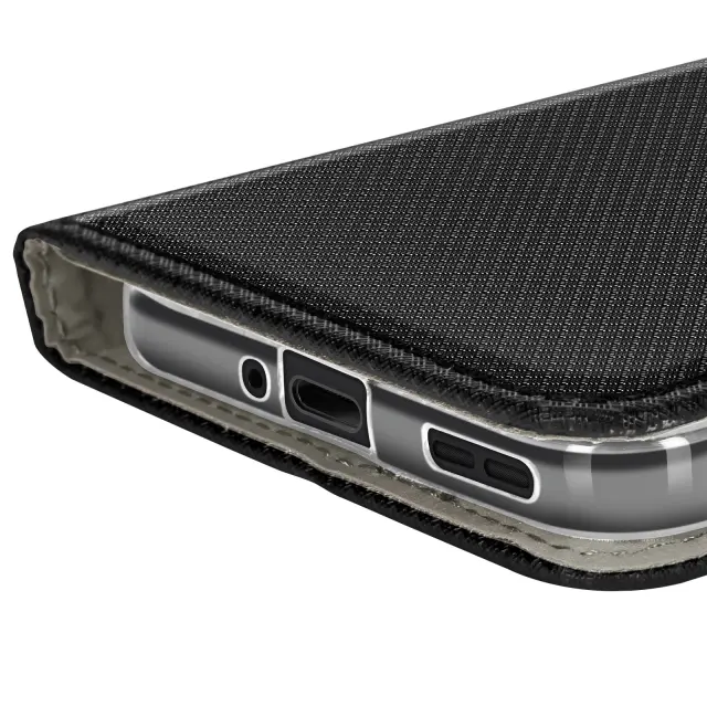 Funkcija denarnice z namenskim prostorom za bančno ali poslovno kartico. Prevleka iz teksturiranega usnja za elegantno zaščito in odličen vsakodnevni oprijem. Mehka silikonska notranja lupina absorbira udarce, gumbi in priključki pa so prosto dostopni.. Vgrajeno stojalo za prostoročno gledanje videoposnetkov ali opravljanje klicev.