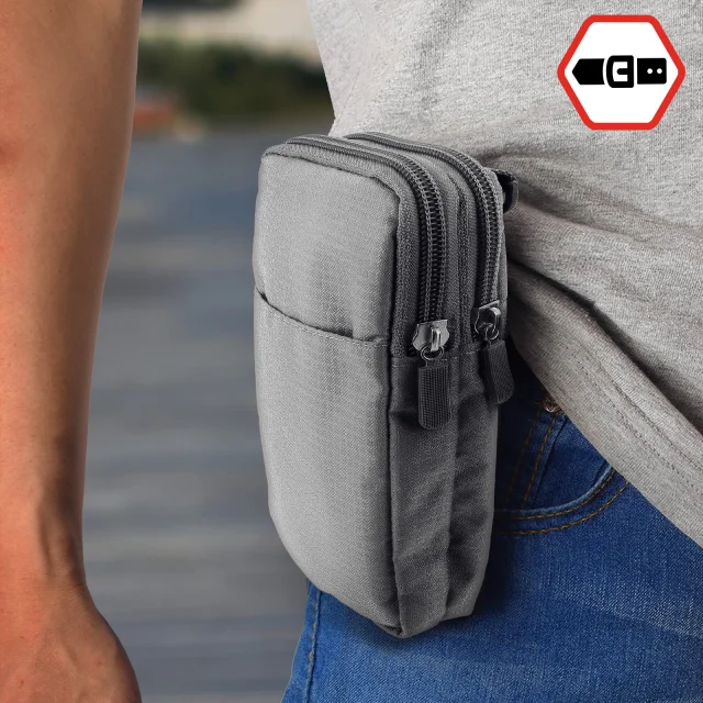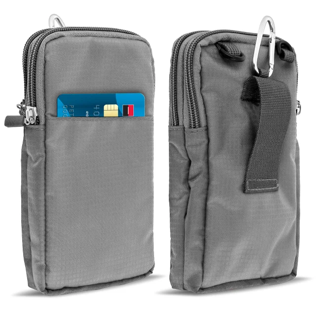 Ovitek za pas/žep z zadrgo za pametni telefon do (V)180 x (Š)110 mm. Zanka za pas na zadnji strani, tako da imate svoje osebne stvari pri roki. Dva žepa z zadrgo za shranjevanje mobilnih naprav ali kreditnih kartic. Mehki notranji predelki, mehka podloga, ki ščiti zaslon in zadnjo stran telefona.