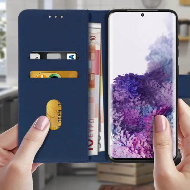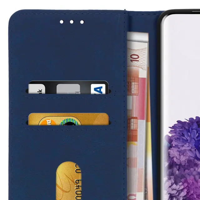 Denarnica posebej zasnovana za Samsung Galaxy S20 Plus. Trezen in eleganten, oblazinjen v ekokožju z videzom razpokanega usnja in z vrhnjimi šivi.. Prilagojena podporna lupina iz prožnega, trpežnega silikonskega gela. V podlogo zavihka so vgrajeni namenski predali za vaše kartice in zapiske.