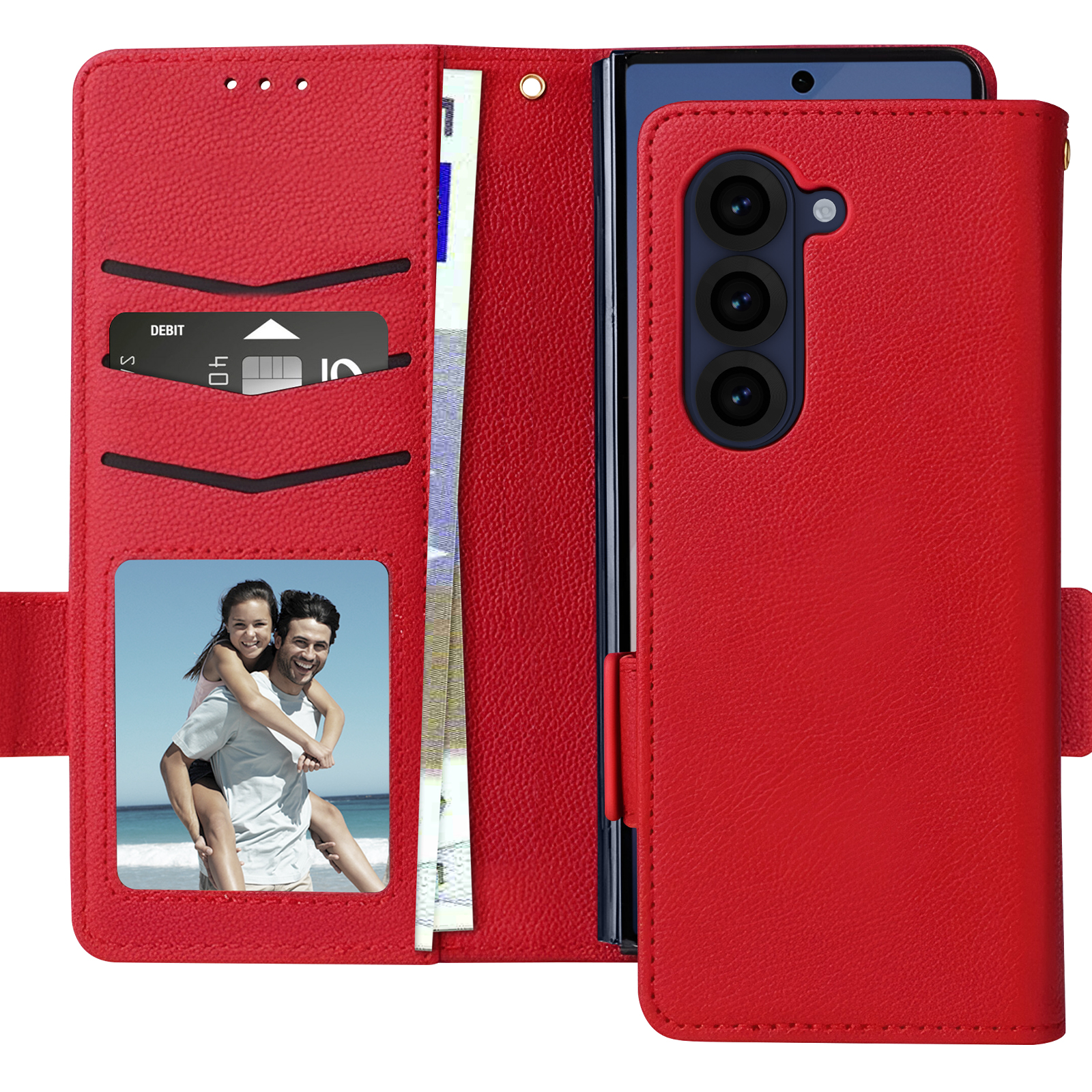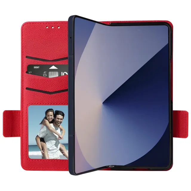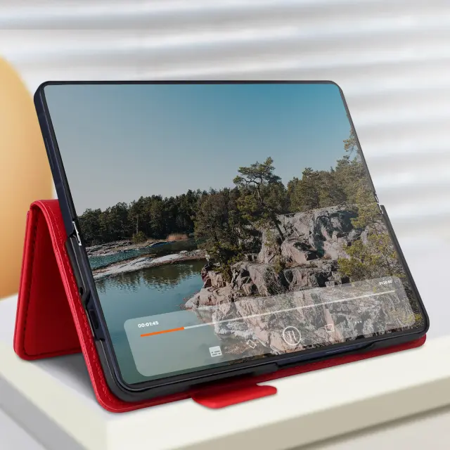 Rdeče ohišje, ki nudi popolno zaščito za vašo naprave, hkrati pa jo lepo obleče. Večnamenski zavihek s prostorom za shranjevanje kartic in zapiskov. Zložljiv zavihek služi kot nosilec za videoposnetke, da lahko v celoti uživate v vsebini.. Magnetni zavihek za varno zapiranje ovitka.