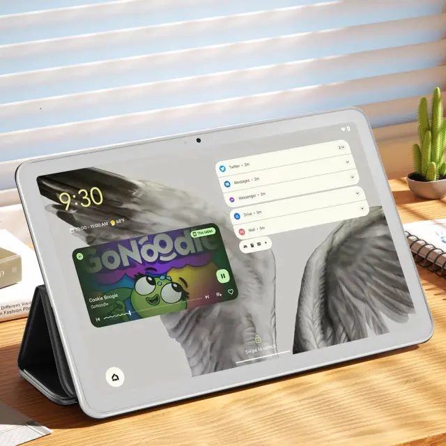 Trojni ovitek za tablico Google Pixel. Ima podporno loputo z dvema razlicnima kotoma za gledanje videoposnetkov in uporabo tipkovnice. Ta etui ima na dotik mehko notranjost, ki šciti vaš tablicni racunalnik pred praskami.