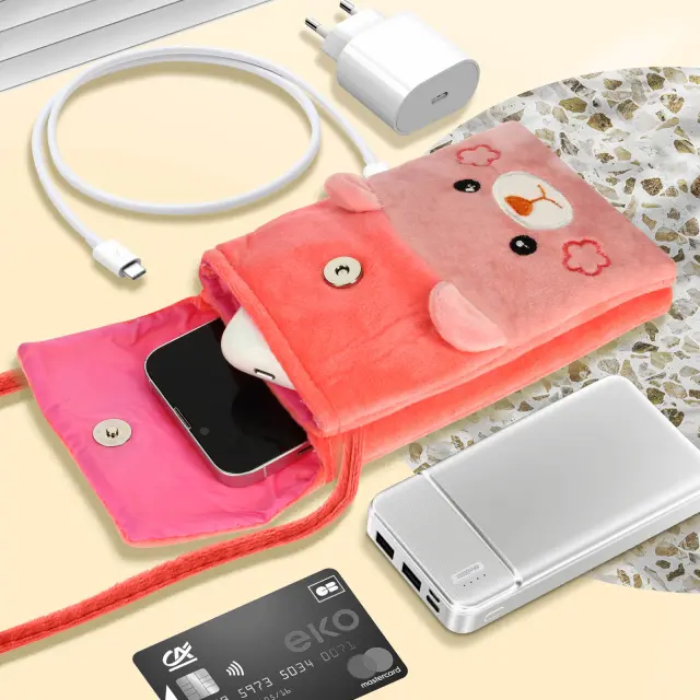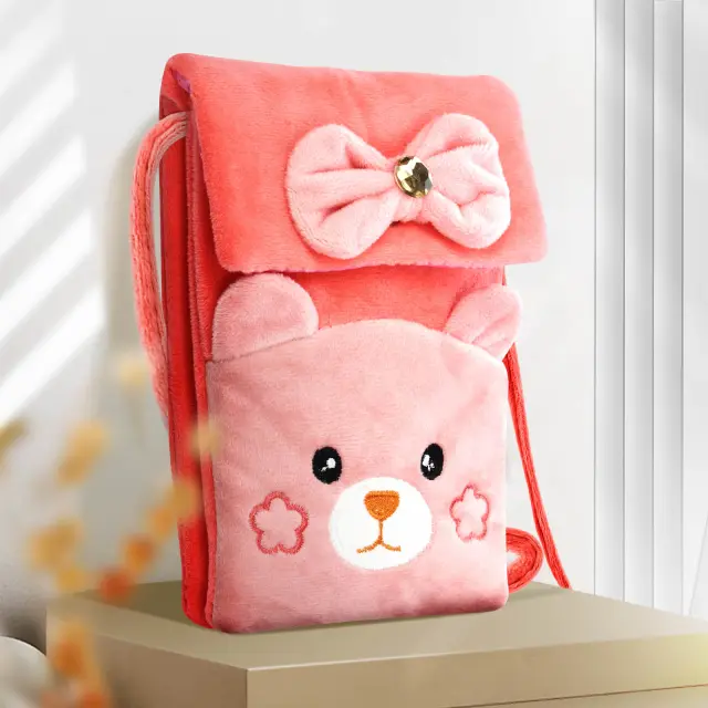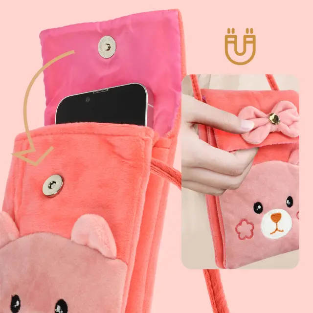 Torbica čez telo za shranjevanje vaših pametnih telefonov, ko ste na poti. Drugi predal za shranjevanje vaših osnovnih stvari, kartic, napajalnika, polnilnika itd. Trendovski in prikupen dizajn medvedka, ki izstopa iz množice. Zaradi svoje tkanine je mehak kot plišasti medvedek.
