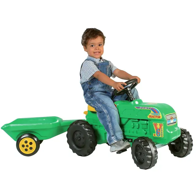 Traktor 54x78x45 cm, s prikolico 23x66x34 cm. maksimalna teža do 50 kg. Izdelan iz kvalitetne, močne plastike, mehanizem za premikanje in upravljanje je iz kovine. Primerno za otroke stare 3 leta in več.