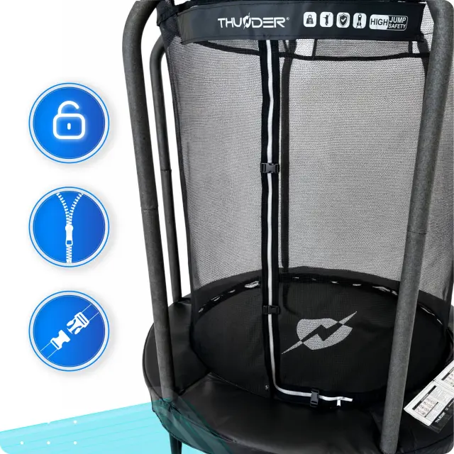 Hitra zadrga in varnostne zaponke zagotavljajo, da je otrok varno znotraj trampolina.