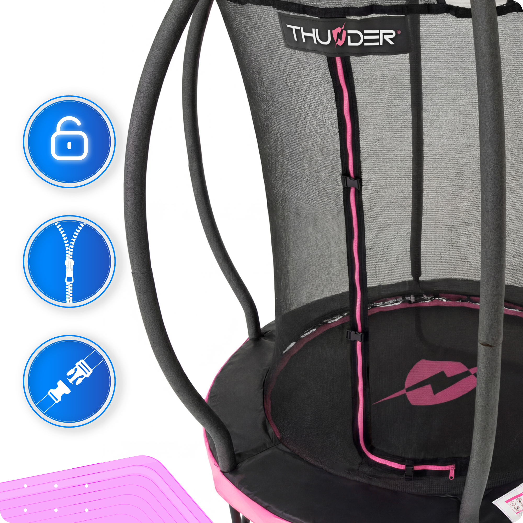 Zadrga in varnostne zaponke ščitijo otroka v notranjosti trampolina.