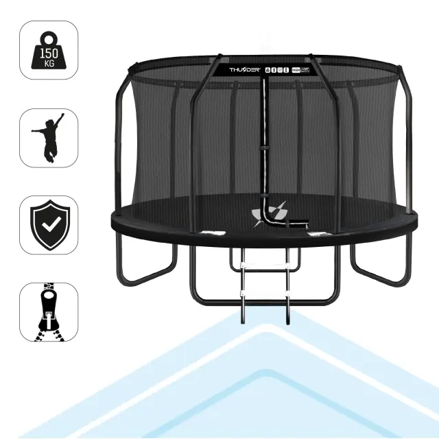 Vrtni trampolin THUNDER® ELITE 12FT je zasnovan za celoletno uporabo na prostem. Trdna konstrukcija, notranja varnostna mreža in visoka kakovost izdelave zagotavljajo zanesljivo, varno in dolgotrajno uporabo tudi pri intenzivnem skakanju.