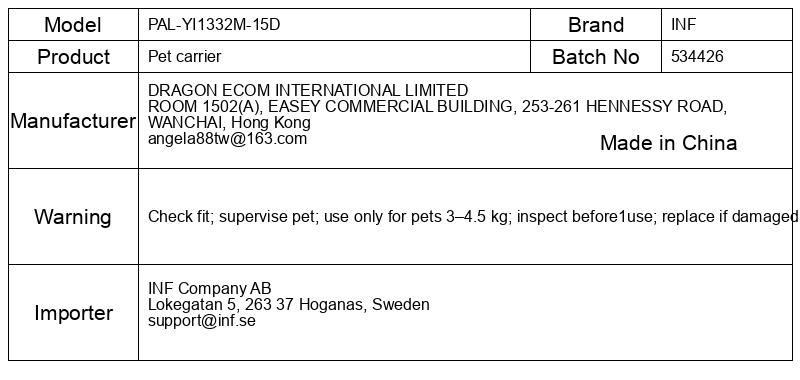 Preverite prileganje; nadzorujte hišnega ljubljenčka; uporabljajte samo za hišne ljubljenčke s težo 3–4,5 kg; pred uporabo preglejte; zamenjajte, če je poškodovan.