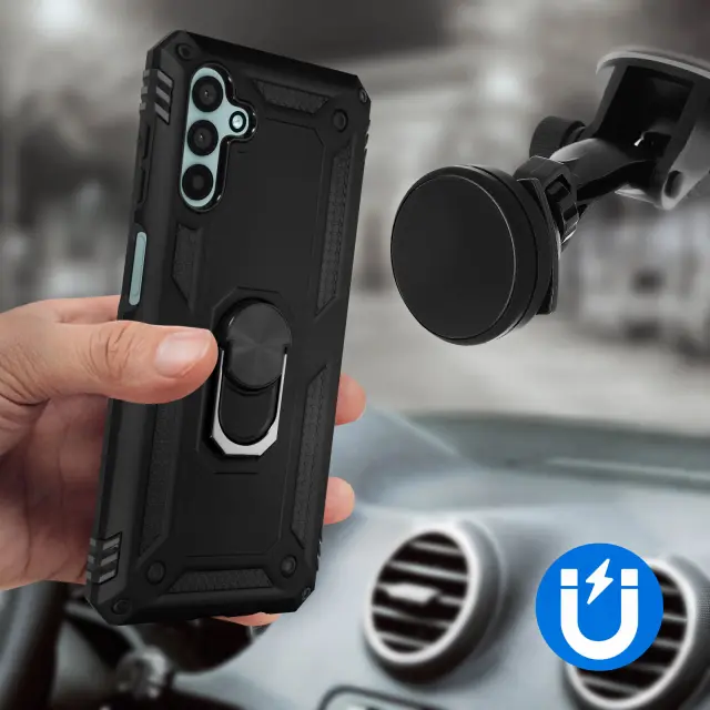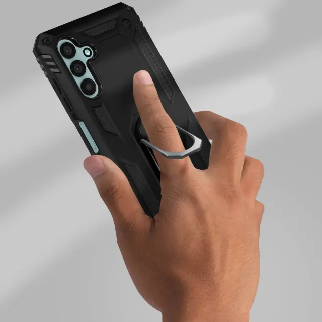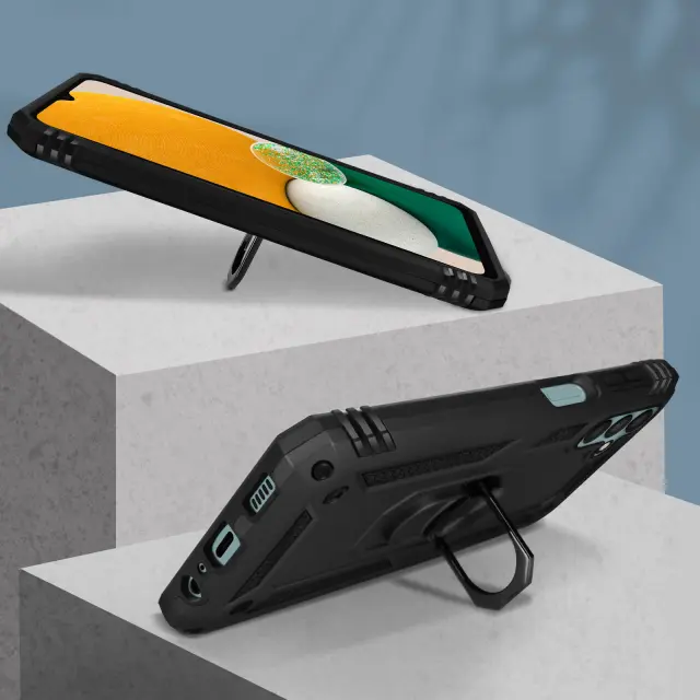 Zaščitna torbica posebej zasnovana za Samsung Galaxy A13 5G / A04s. Bi-Material: polikarbonatna in silikonska zaščita. Vodoravni podporni obroč za udobno gledanje videoposnetkov. Kovinski obroč, združljiv z magnetnimi nosilci.