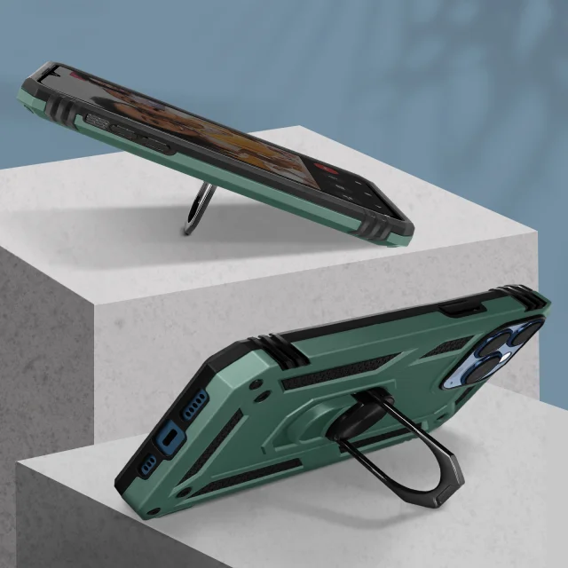 Trden ovitek iz dveh materialov za iPhone 13 Pro s podpornim obrocem - temno zelen