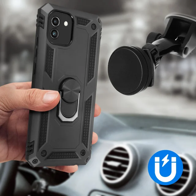 Trden ovitek iz dveh materialov za Samsung Galaxy A03 s podpornim obrocem - crn