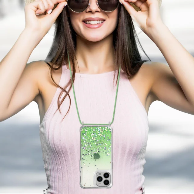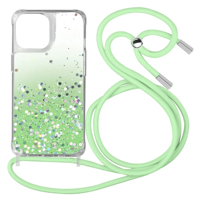Trden ovitek z blešcicami za iPhone 13 Pro Max, odporen na udarce, z nastavljivo vrvico - zelen preliv