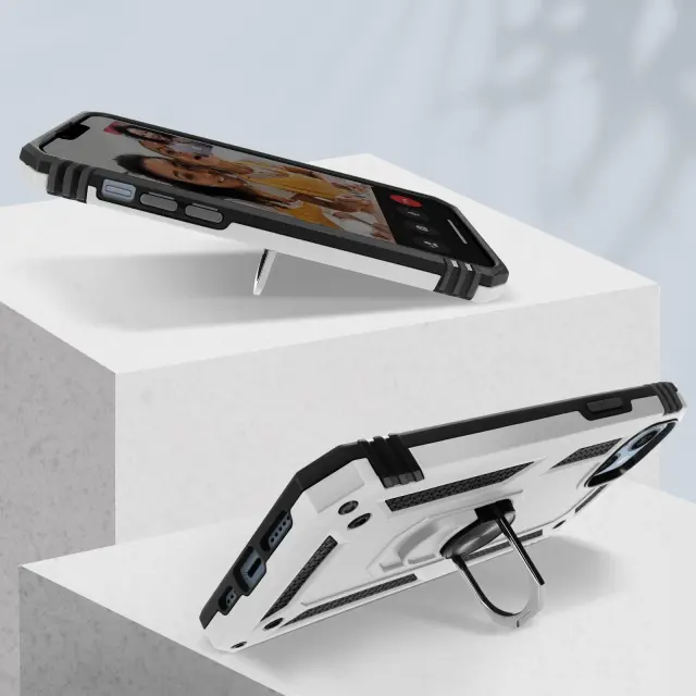 Trden ovitek za iPhone 14 iz dveh materialov s podpornim obrocem - srebrn