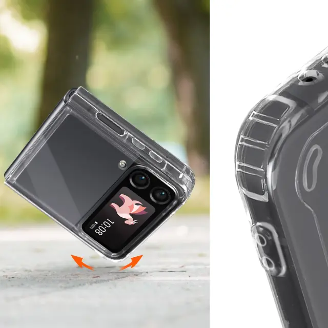 Ta prozoren ovitek za Samsung Galaxy Z Flip 3 šciti vaš pametni telefon in hkrati prikazuje njegov dizajn. Sestavljen je iz dveh delov s togim zadnjim delom in konturo odbijaca, ki šciti mobilni telefon pred nesrecami. Dostopne funkcije.