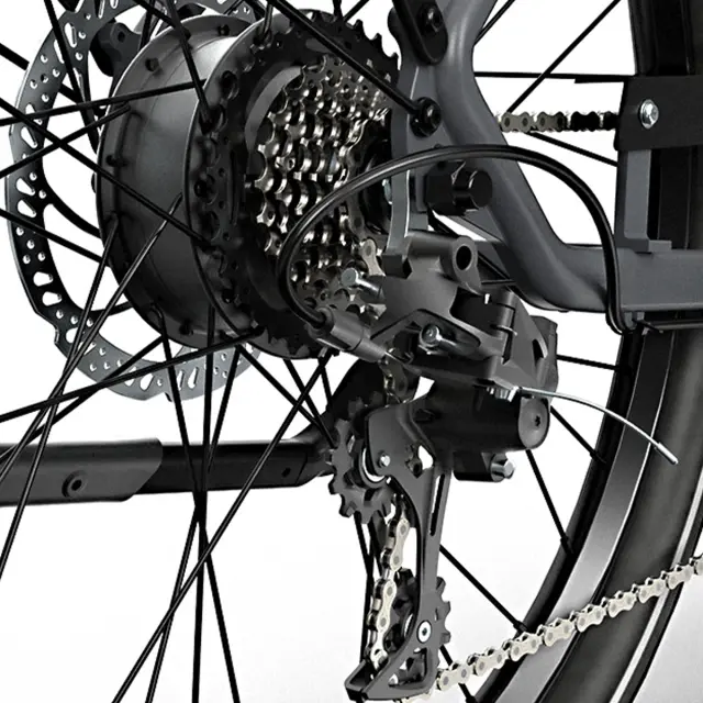 Astra je opremljena z 8-stopenjskim menjalnikom Shimano in ponuja prilagodljive možnosti prestavljanja, ki omogočajo učinkovito vožnjo po ravnih cestah ali strmih vzponih, kar izboljša udobje in nadzor tako za kolesarje, ki potujejo na delo, kot za rekreativne kolesarje.