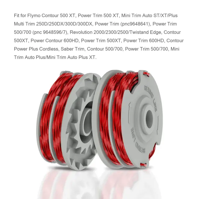 Nadomestna tuljava z vrvico za prirezovanje trave, primerna za naslednje obrezovalnike trave: Flymo Contour 500 XT, Power Trim 500 XT, Mini Trim Auto ST/XT/Plus Multi Trim 250D/250DX/300D/300DX, Power Trim (pnc9648641), Power Trim 500/ 700 (pnc 2/0705 Revolution 96085), /2300/2500/Twistand Edge, Contour 500XT, Power Contour 600HD, Power Trim 500XT, Power Trim 600HD, Contour Power Plus Cordless, Sabre Trim, Contour 500/700, Power Trim 500/ 700, Mini Trim Auto Plus/Mini Trim Plus XT.