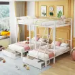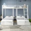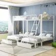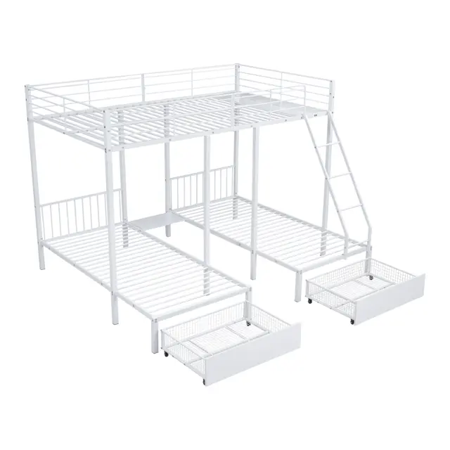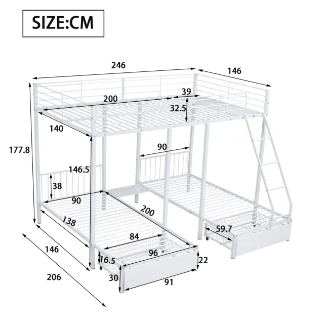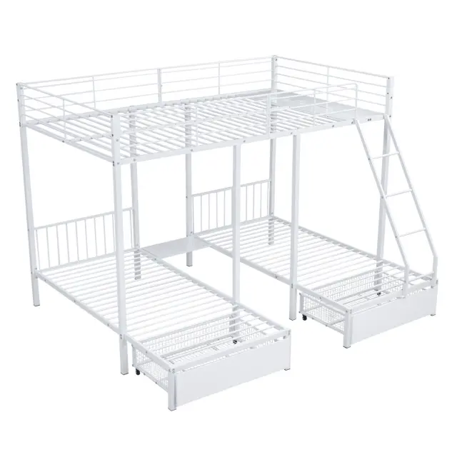 Trojna pogradna postelja (246 x 206 x 177,8 cm), bela kovina. Za 3 osebe, 2 predala. Enostavna montaža. Trpežna in prihrani prostor.