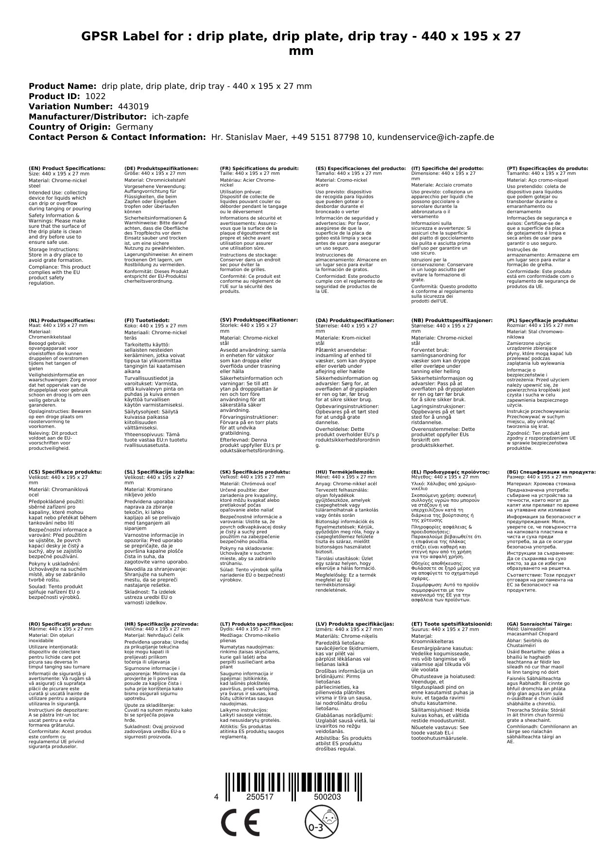 Tropna pločevina, odcedna pločevina ali posoda za kaplje v velikosti 440 x 195 x 27 mm je popolna za zajemanje odvečne tekočine. Iz kromnikljevega jekla z mat površino, dvoslojna rešetka omogoča odtekanje vode in enostavno čiščenje.