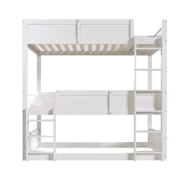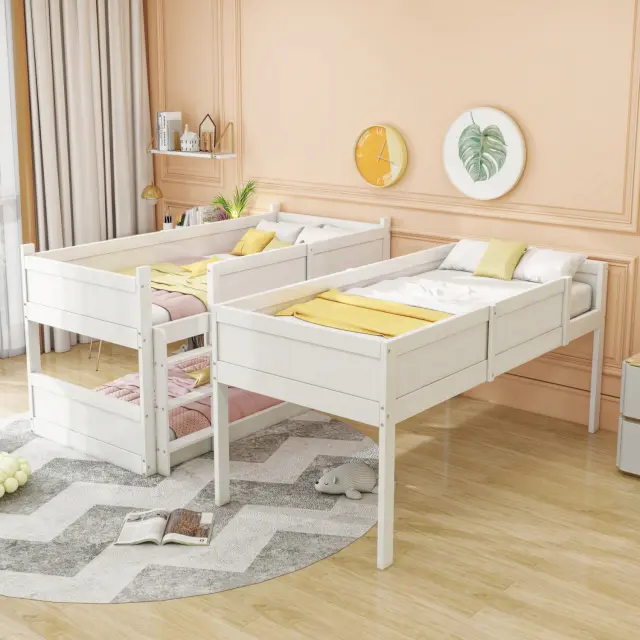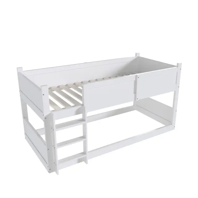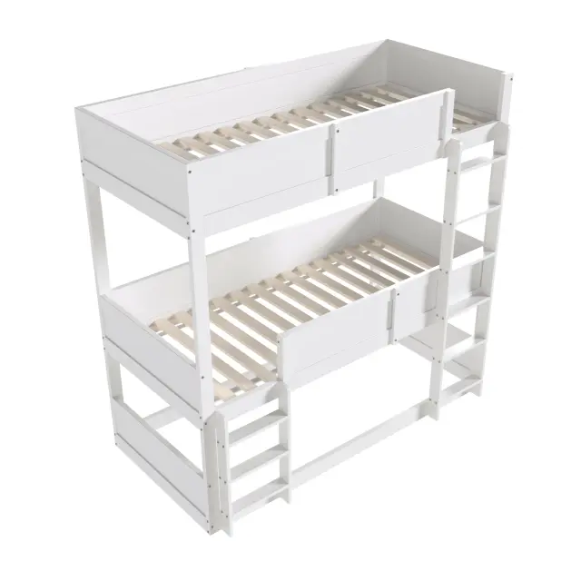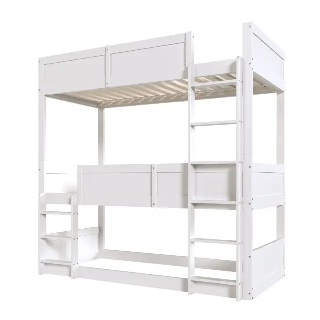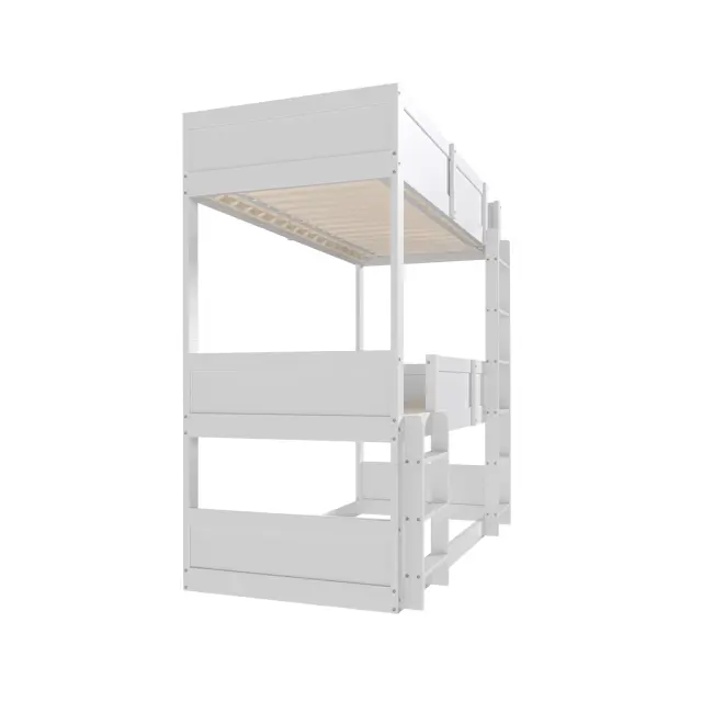 Ta tristopenjska postelja iz masivnega lesa (90 x 200 cm) optimalno izkorišča prostor in otrokom ponuja varno in udobno mesto za spanje. Lahko se spremeni v enojno posteljo in posteljo za malčke.