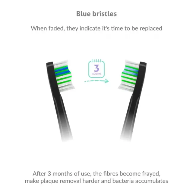 Glava zdrži približno tri mesece uporabe, potem pa se začne cefrati, izgublja na učinkovitosti, poleg tega pa se na njej kopičijo bakterije. Na srečo so glave opremljene z modrimi ščetinami, ki po treh mesecih zbledijo in vi takoj veste, da je potrebno zamenjati glavo.