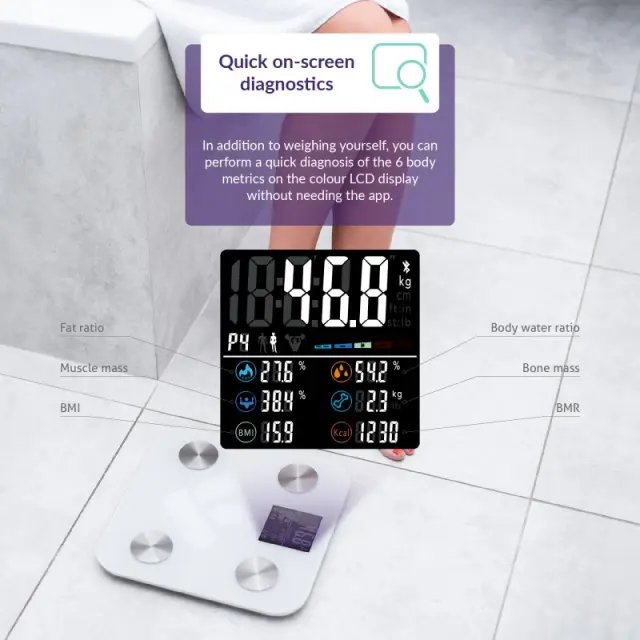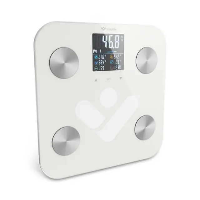 Predstavljajte si osebno tehtnico, ki je tako pametna, da boste z njo svoje telo spoznali do potankosti. TrueLife FitScale W6 BT to zmore. Zelo natančno prikaže vašo trenutno maso in s pomočjo bioelektrične impedančne analize doda številne druge uporabne informacije. Vse boste pregledno videli na barvnem zaslonu LCD s sedmimi telesnimi indeksi. Tehtnica je tako inteligentna, da bo samodejno prepoznala uporabnika. Prvovrstno prekrivno steklo zdrži maso do 180 kg. Tehtnica bo zadoščala za hitro diagnostiko telesa, a če vas bo zanimal opis vseh merjenih indeksov, je odlična tudi mobilna aplikacija. Samo prek tehnologije Bluetooth povežete tehtnico s telefonom in v aplikaciji boste takoj videli popolno telesno poročilo in statistiko.