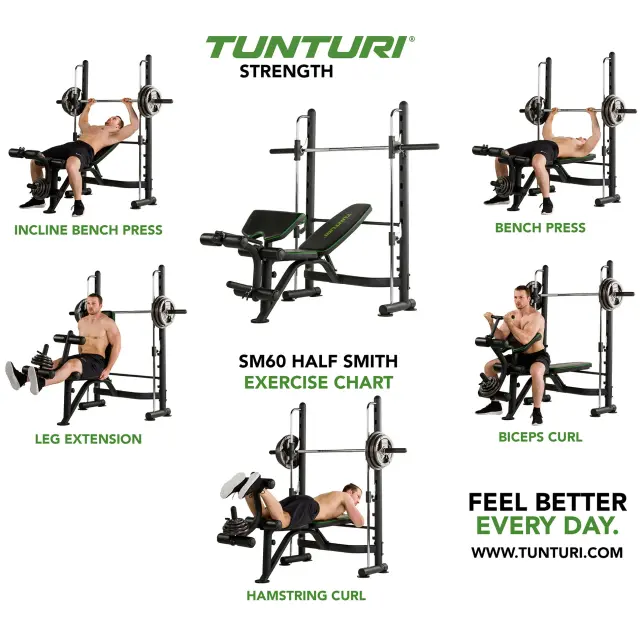 Tunturi SM60 je unikatna klop, ki jo odlikuje kombinacija klasične bench klopi z Smith vodili, ki omogočajo odlog bremena. Tako ne boste potrebovali prositi vašega prijatelja ali ga čakati, da skupaj opravita trening.