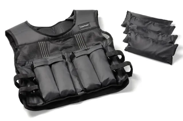 Tunturi obtežilni jopič teže 10 kg. Vsebuje 8 ploščic težkih 1.25 kg. Težo jopiča lahko tako poljubno spreminjate. Ko boste pričeli z vadbo, lahko težo zmanjšate. Z napredkom in redno vadbo pa si boste težo lahko povečali.
