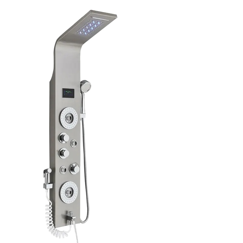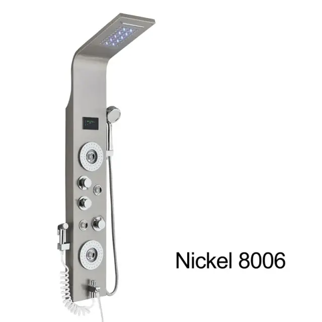 Enostavne kontrole: Prilagodite temperaturo in pretok vode s pritiskom na gumb na elegantnem črnem tuš panelu. LCD zaslon omogoča jasno vidljivost in nadzor nad nastavitvami tuša.