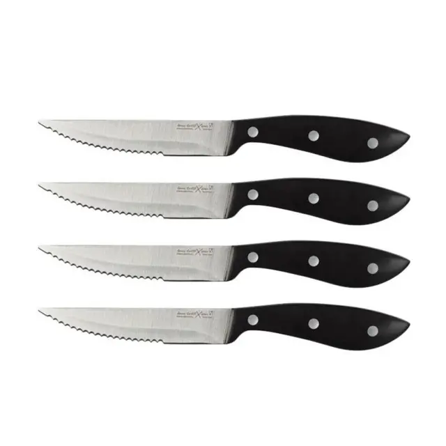 Komplet štirih nožev za zrezke TuttiXuno Steak Jumbo z nazobčanim rezilom iz nerjavečega jekla in zakovičenim ročajem iz polipropilena, v dolžino meri 21,5 cm (dolžina rezila 11,5 cm). Noži so zasnovani tako za restavracijo kot domačo uporabo in imajo ostra, robustna rezila, ki olajšajo rezanje zrezkov s T-bone.