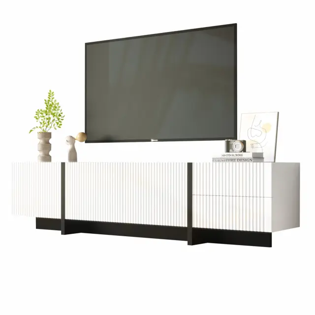 Ta elegantna TV omarica (190 x 35 x 45 cm) ponuja veliko prostora za shranjevanje z 2 predaloma in 3 vrati. Ima tečaje z mehkim zapiranjem, stabilnost in preprosto črno-belo obliko.