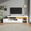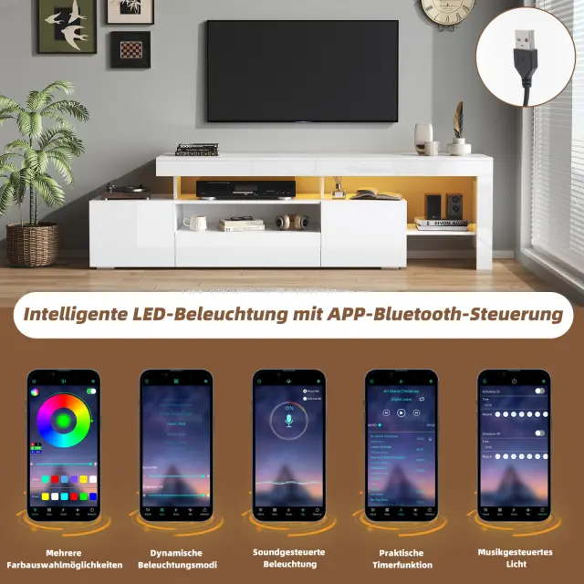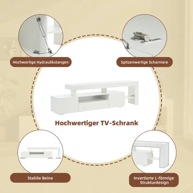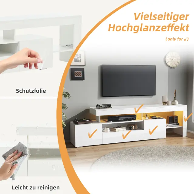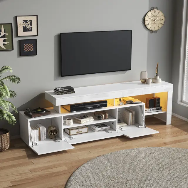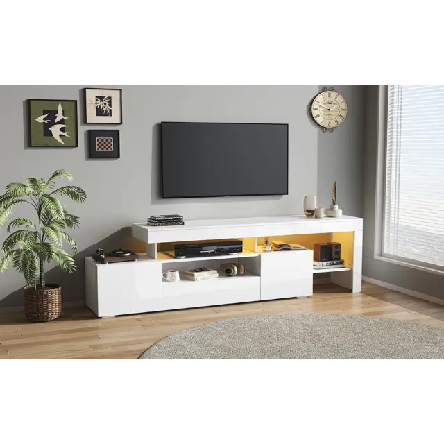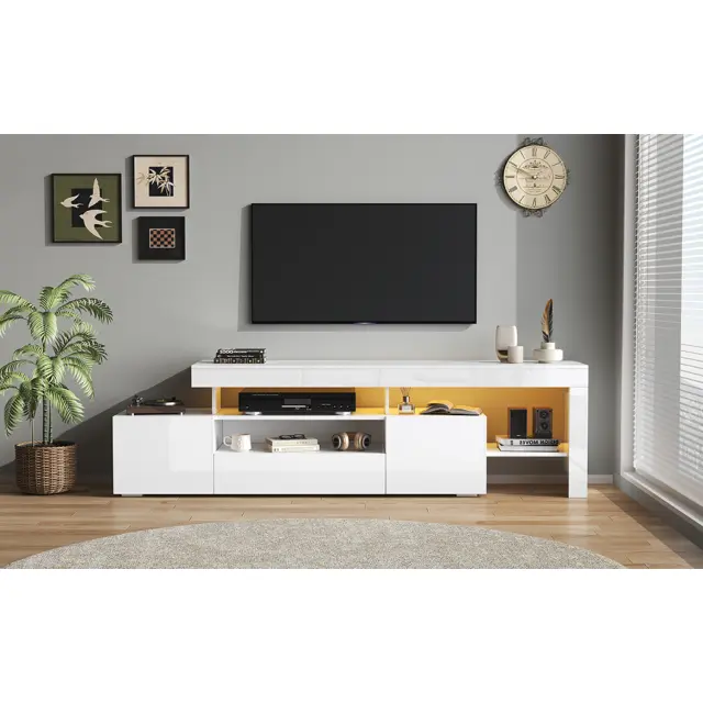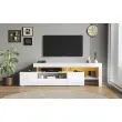 Ta bela visokosijajna TV omarica z dimenzijami 192 x 37 x 53 cm ponuja veliko prostora za shranjevanje s tremi vrati, odprtimi policami in LED osvetlitvijo. Primerna je za televizorje do 85 palcev (214 cm) in teže 30 kg.
