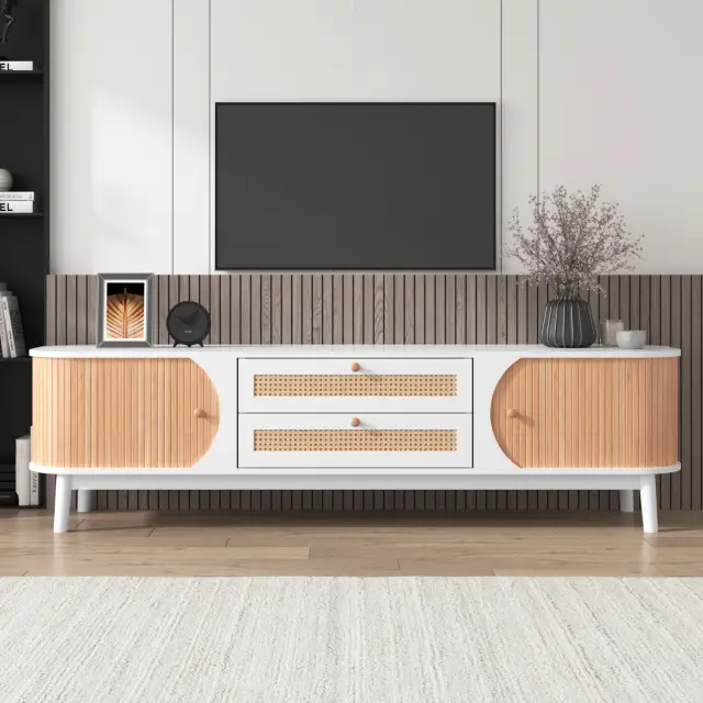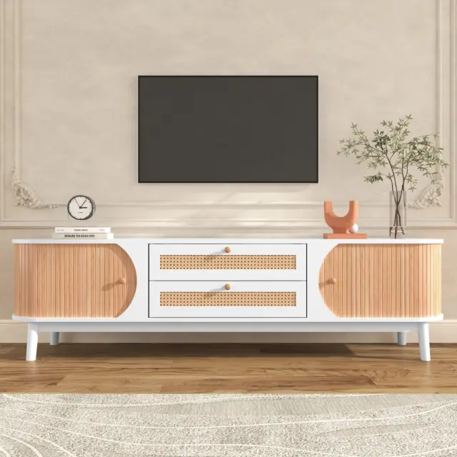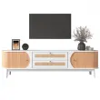TV omarica iz mešanice naravnega lesa z vrati, predali in ratanovimi stranicami